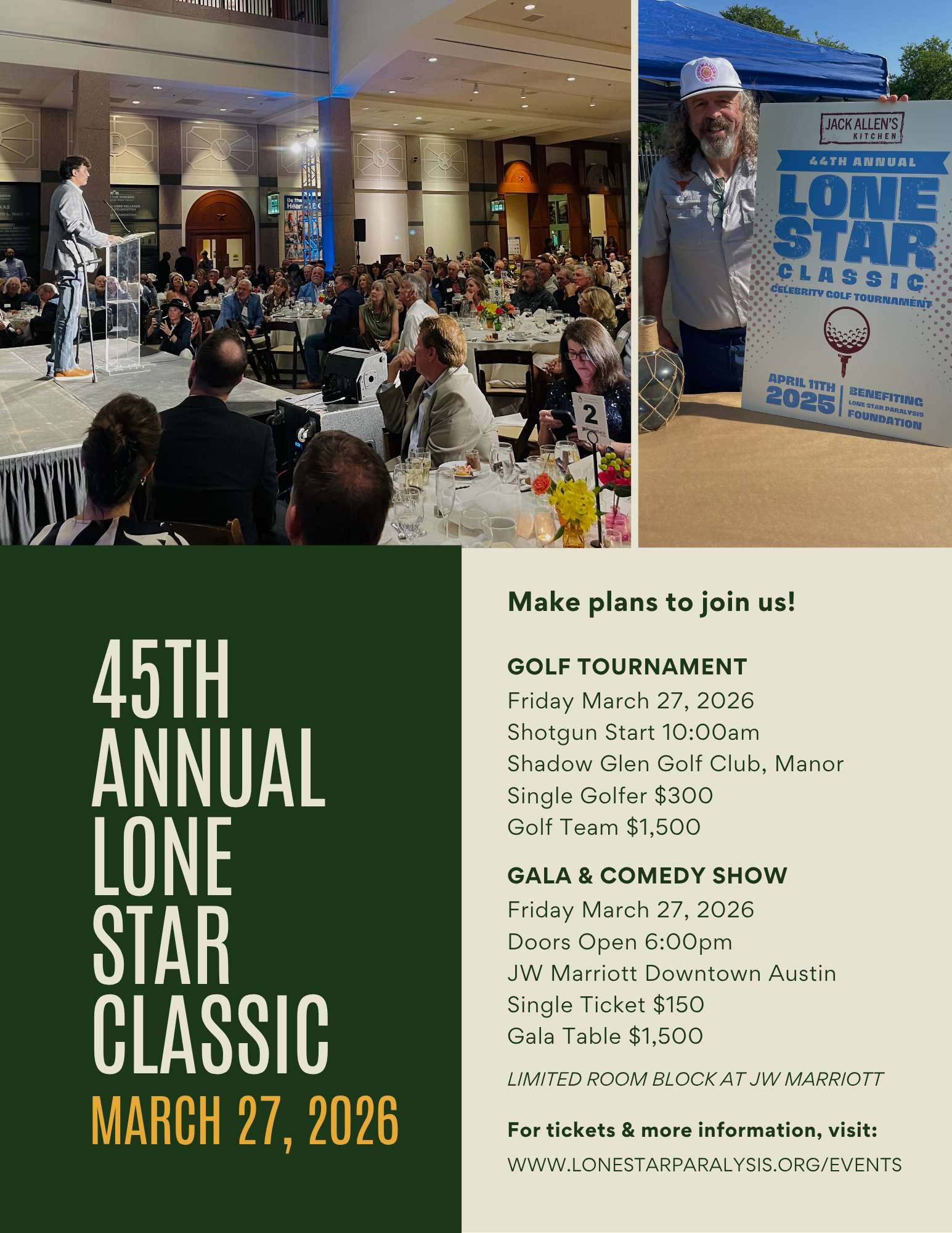To celebrate this milestone of hosting the 45th Lone Star Classic, we are celebrating at a new venue! Join us March 27, 2026 at the JW Marriott downtown Austin for a wonderful evening raising money for a great cause. The Golf Tournament will remain at Shadow Glen Golf Club the morning of March 27th. Tickets are available for purchase at this link.